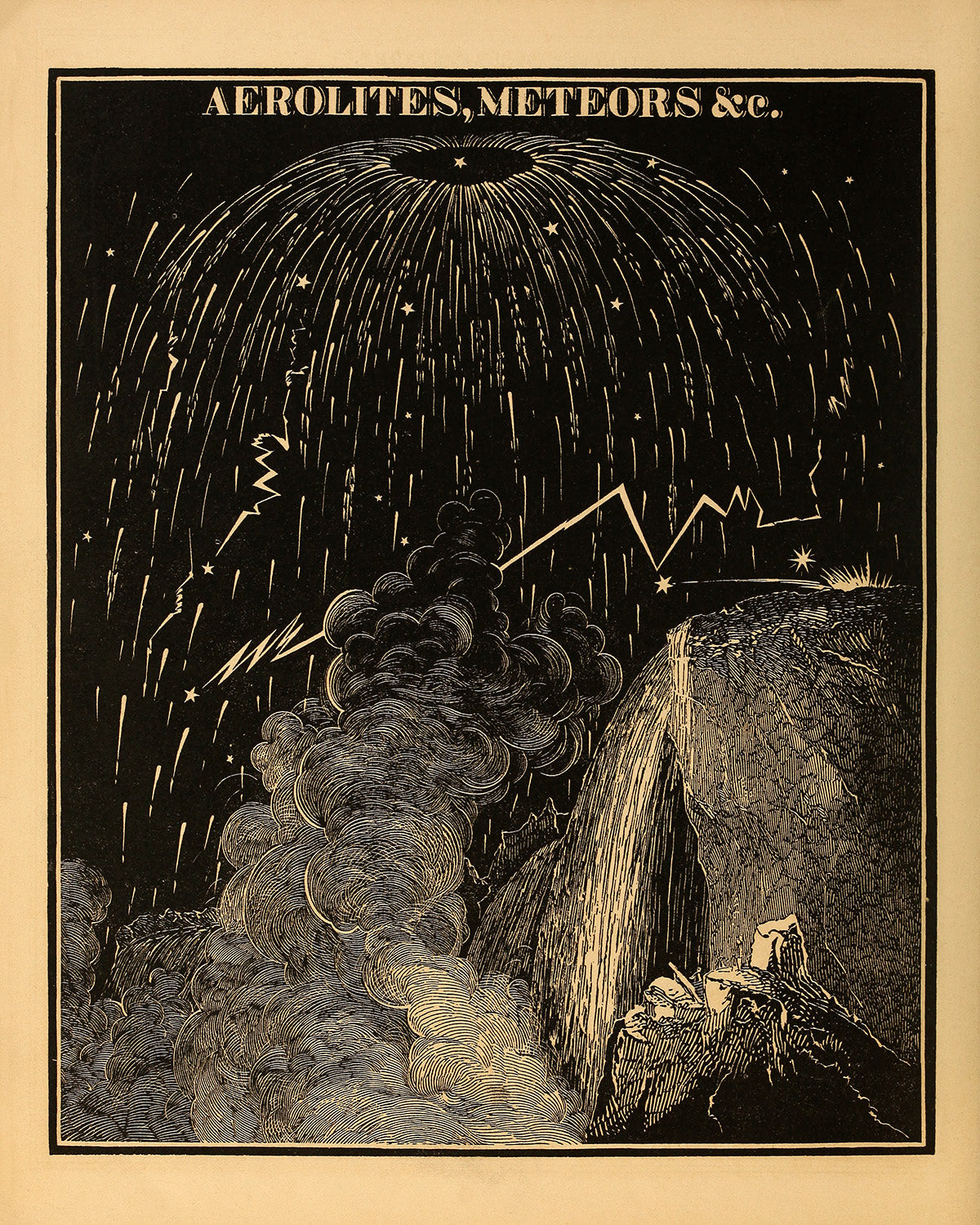Aerolites & Meteorites illustration featuring meteor shower from an educational school book. Circa 1855.