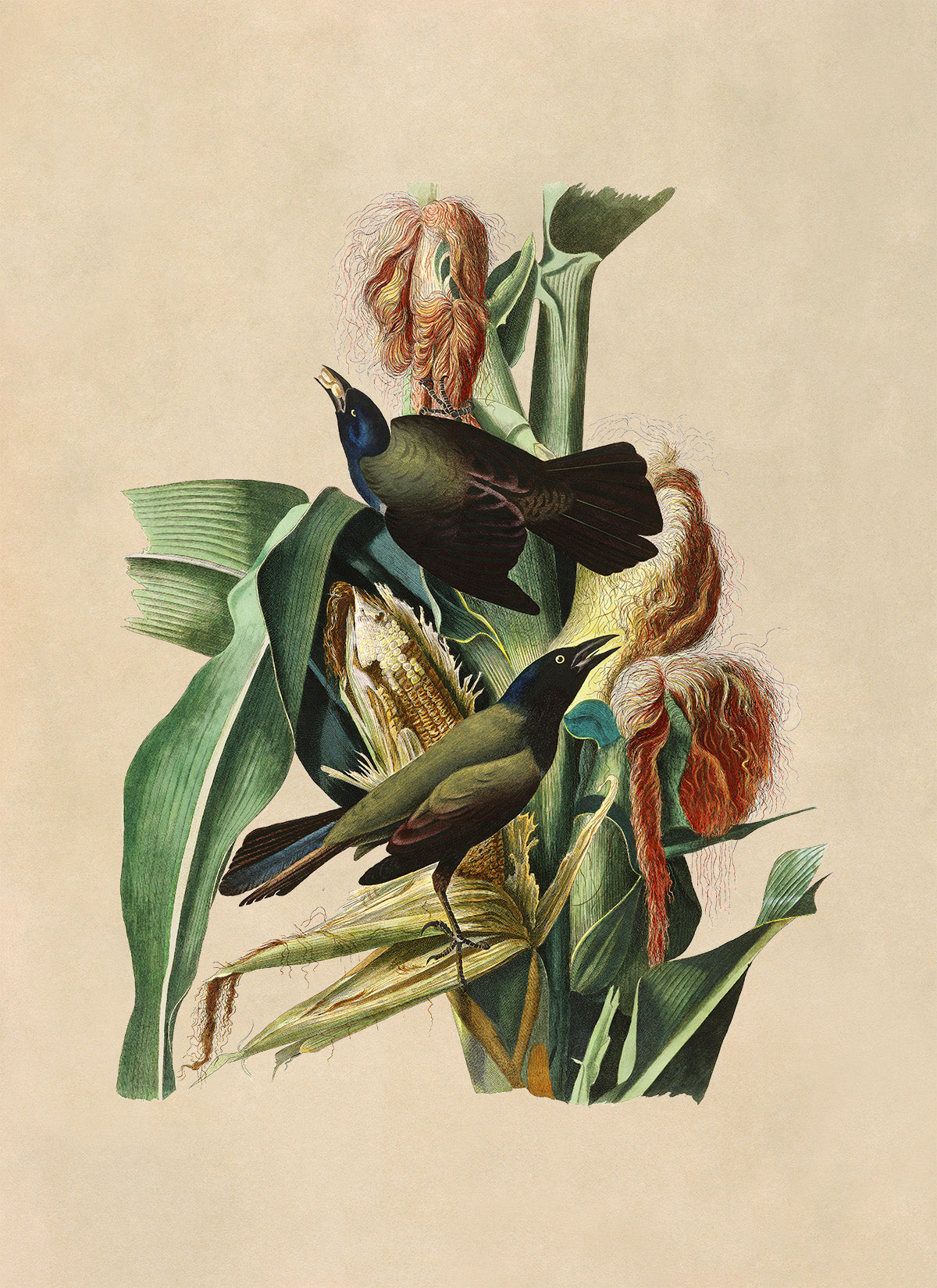Purple Grackle or Common Grackle from John James Audubon's, "Birds of America" print series. Circa 1838.